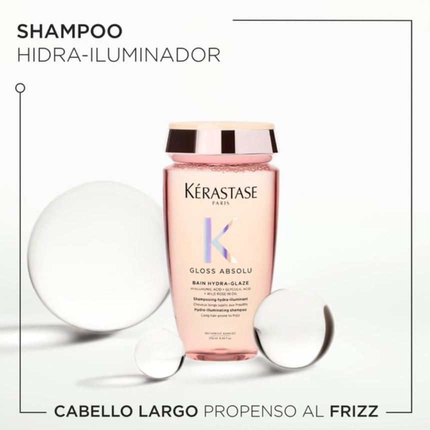 Bain Hydra-Glaze de Kérastase es un shampoo hidratante-iluminador para el cabello largo con tendencia al frizz. Está específicamente formulado con Ácido Hialurónico, Ácido Glicólico y Extracto de Rosa Silvestre para cabello glossy, suave y ligero.